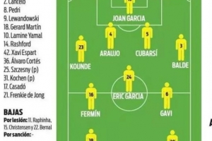 每体预测巴萨首发:巴德吉、加维出战,佩德里、亚马尔替补