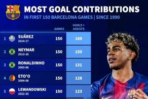 巴萨生涯前150场直接参与进球榜:(图片来自本场比赛赛前)