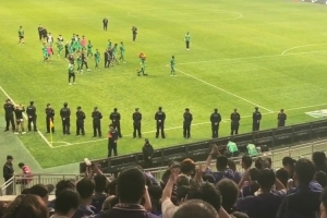 赛后谢场国安路过天津球迷看台,天津球迷鼓掌送上“国安加油”