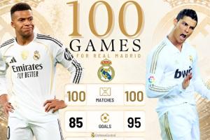姆巴佩在代表皇马出战的100场比赛中,打入85粒进球,其中包括19粒点球,总出场时间8160分钟;C罗代表皇马出战的前100场比赛中,打入95粒进球,其中包括16粒点球,总出场时间8464分钟。两人在皇马的前两个赛季,均未能收获西甲或欧冠冠军。
