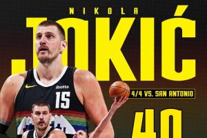 近7场5次砍下大三双约基奇轰40分8板13助0失误创中锋历史纪录